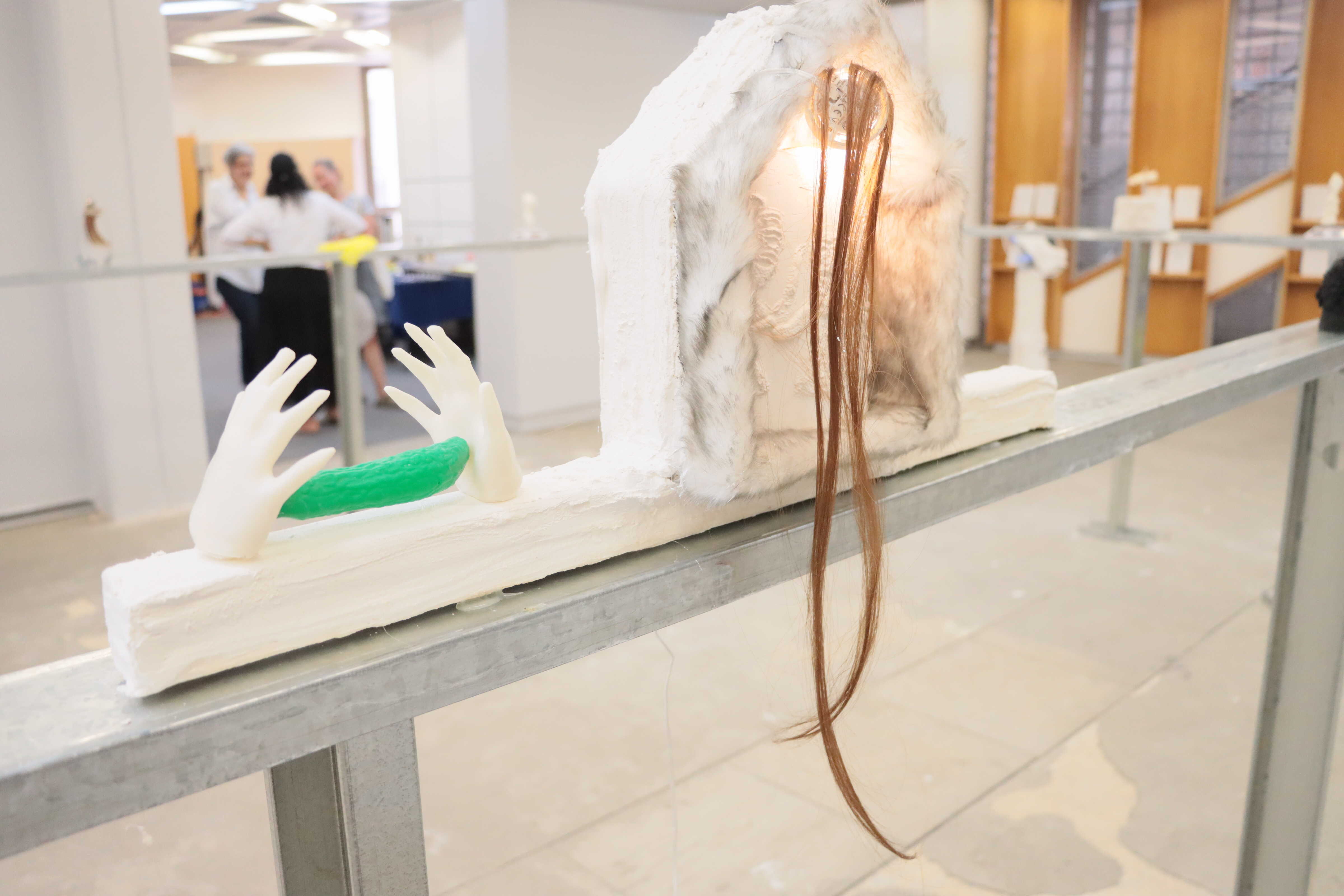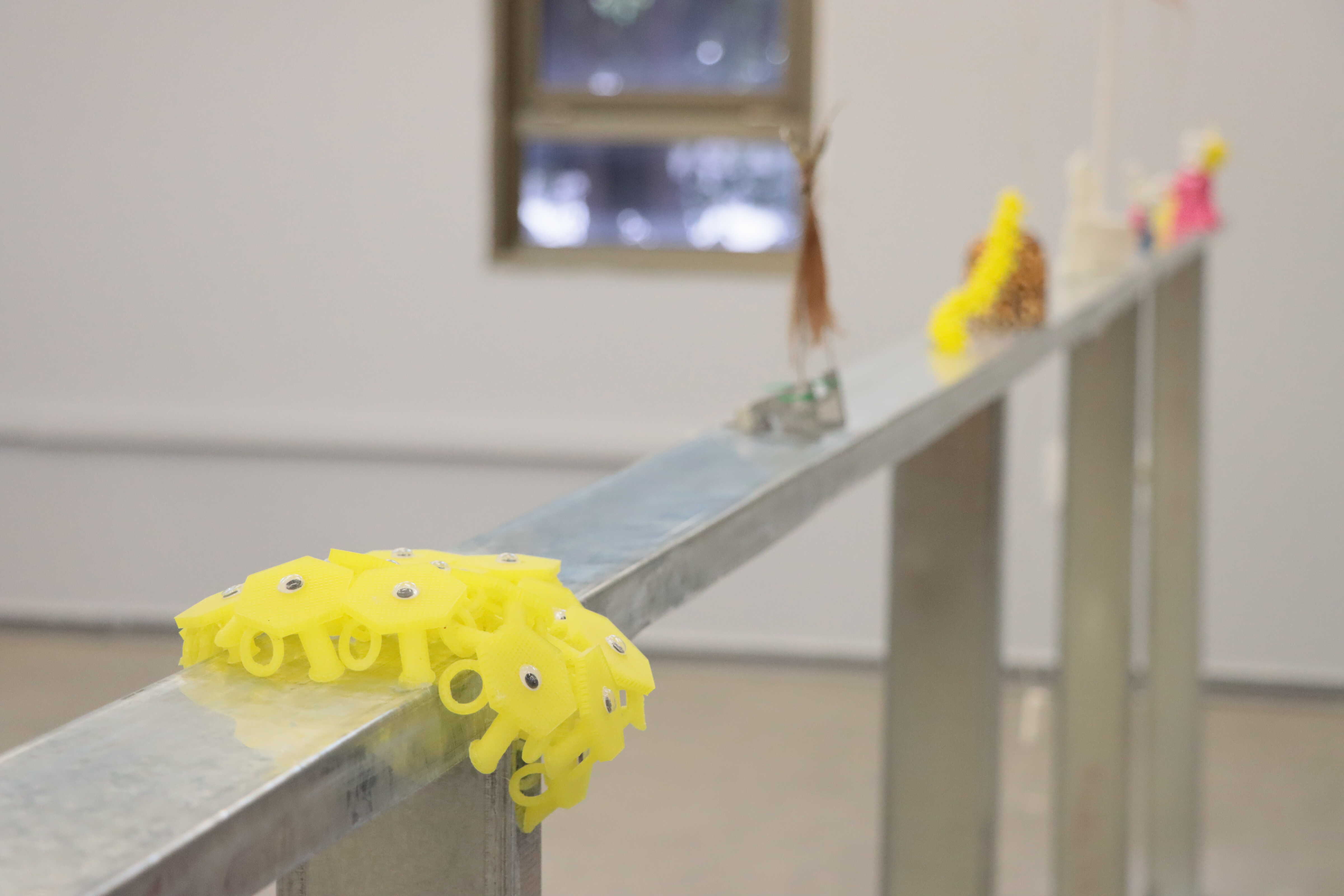 כשברקע נשמע קול שירה של אם לבתה הבוקע מעבודת וידיאו בחדר האחורי, לצידה של עבודת קולאז' של מונוטייפים צבעוניים הנפרשת כציור נוף, ניצב במרכז החלל של "חדר במלון קיסר" מיצב פסלים קטנים שכמו נעים מבלי לנוע על מסילת אלומיניום, ספק מסוע ספק שרשרת פנינים העשוייה להיפרם. 'בית פרווה', 'בלרינה', 'רפונזל', 'צלמית' 'אשת מנורה' או 'מחזיקות מלפפונים' - אלה הן חלק ממארג דימויים ודמויות נשיות, צלמיות, תבליטים ופסלונים היברידיים קטנים, נשיים וסיפוריים, העשויים ומשלבים חומרי יצירה פשוטים, חפצים ממקס סטוק, צעצועים ומלאכת יד, או וכמו-גם מודפסות במדפסת תלת מימד.